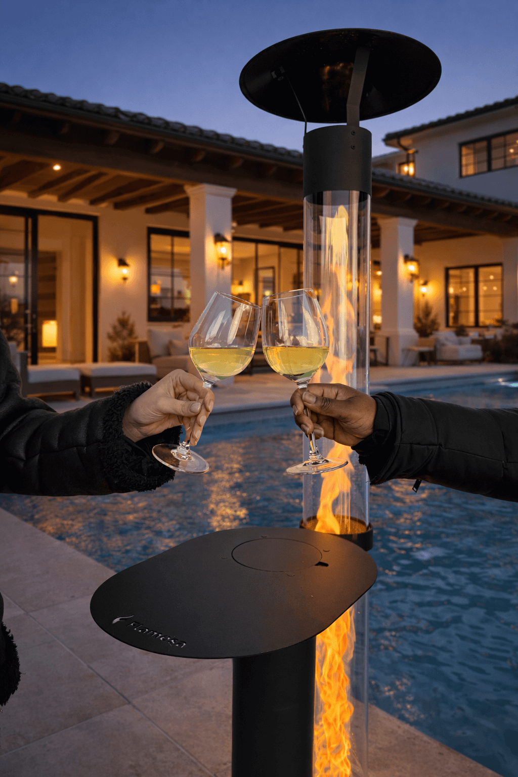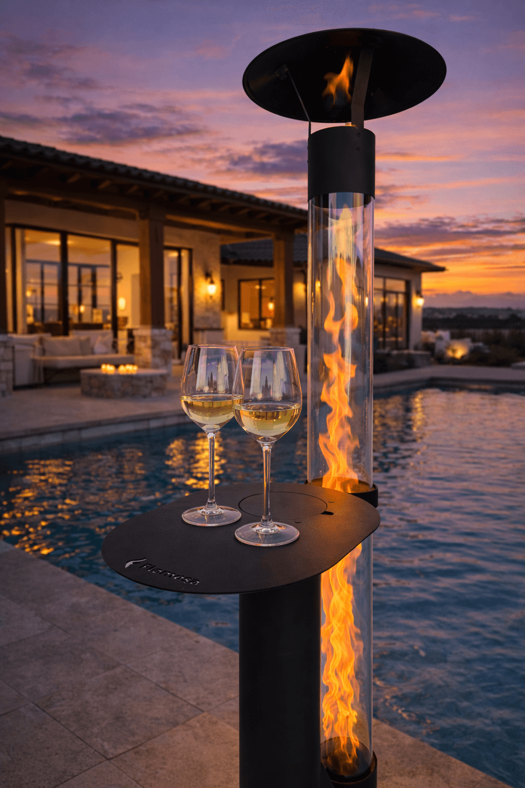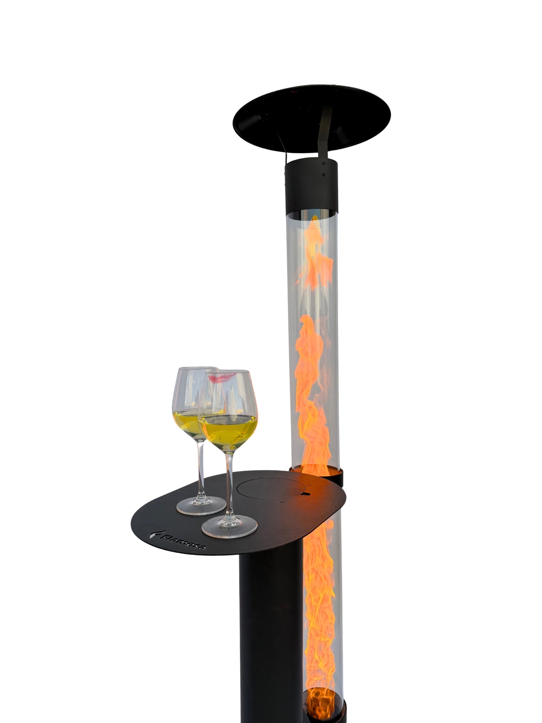 Het onderscheid zit in de combinatie van een verticale glazen vlamkolom, een slank stalen frame met hoogwaardige poedercoating en een geïntegreerde tafel. Dit zorgt niet alleen voor een krachtig vuurbeeld, maar ook voor een rustige, moderne uitstraling die past bij hoogwaardige buitenruimtes.