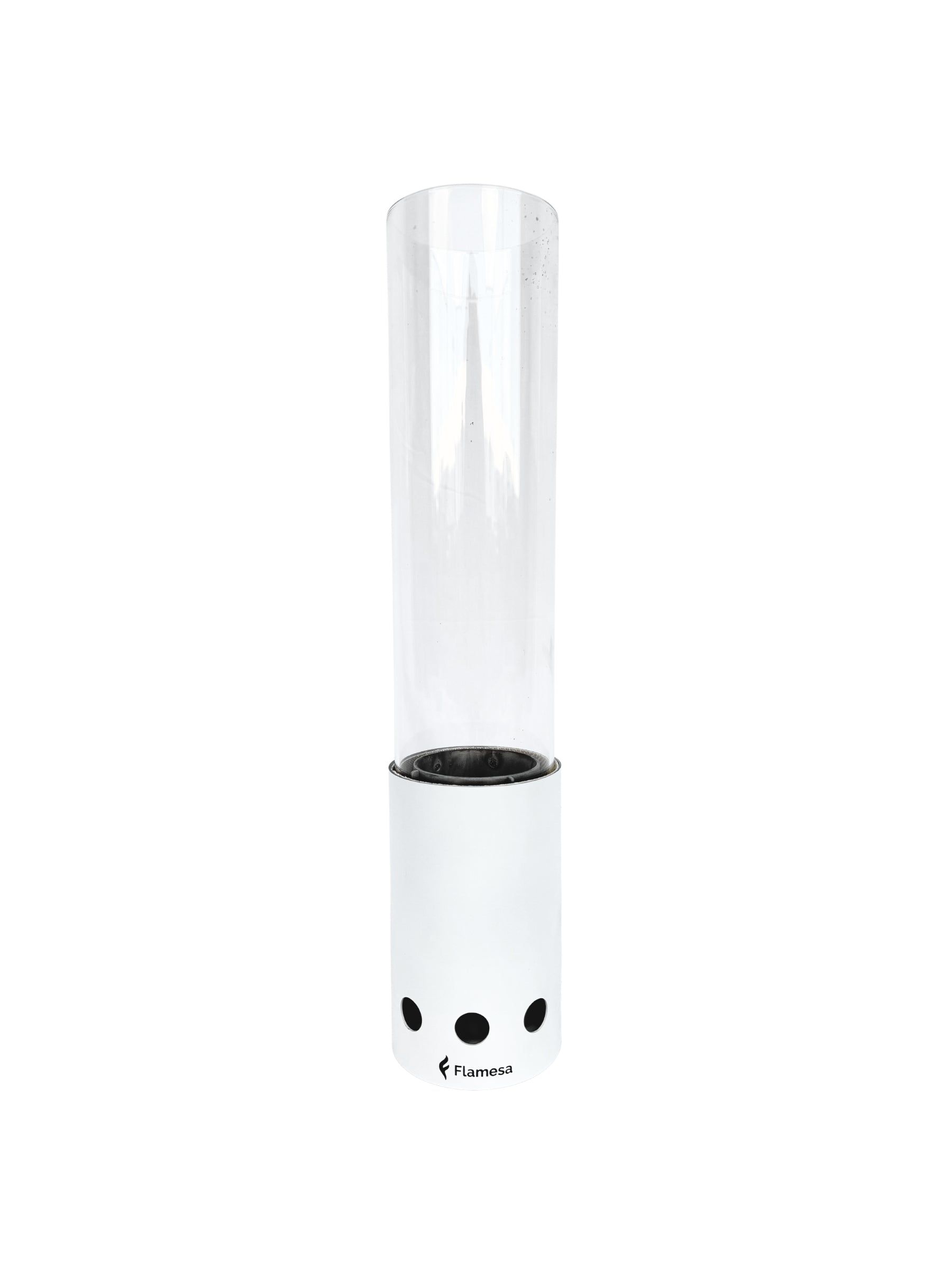 De Flamesa Pyra is opgebouwd uit massief staal met hittebestendige poedercoating en een extra dikke glazen buis. De stevige cilindervorm zorgt voor stabiliteit tijdens gebruik.